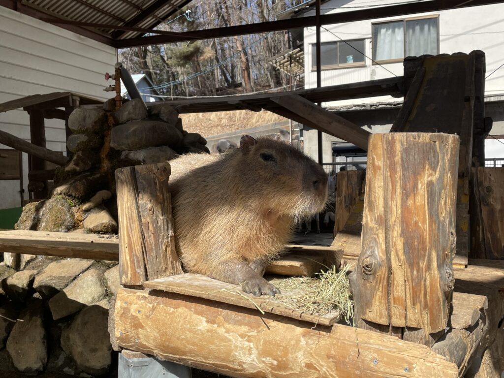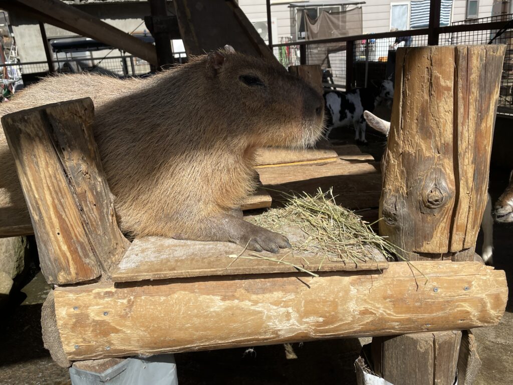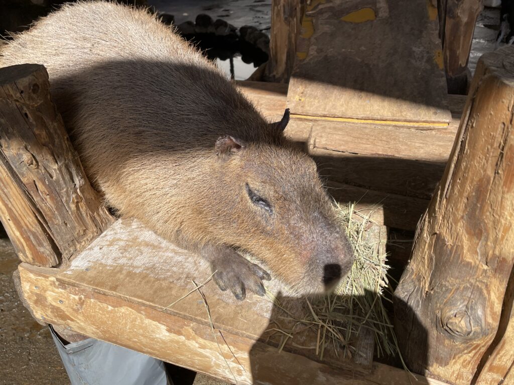 今日は日中太陽が出て暖かかったので、カピバラさんも陽の当たるところでのんびりしてました♪ 目の前に乾草を置いてあげるとまったりくつろぎながら、モグモグ食べ始めました!食べてる様子が可愛かったので、思わず写真や動画を撮ってしまいました😆 ◂ 前のページに戻る